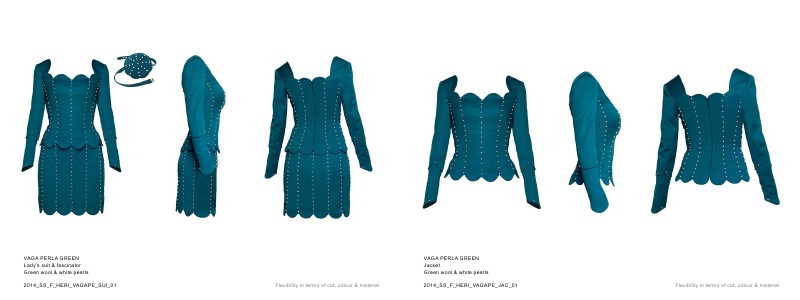 VAGA PERLA GREEN Lady’s suit & fascinator Green wool & white pearls 2014_SS_F_HERI_VAGAPE_SUI_01 Flexibility in terms of cut, colour & material
