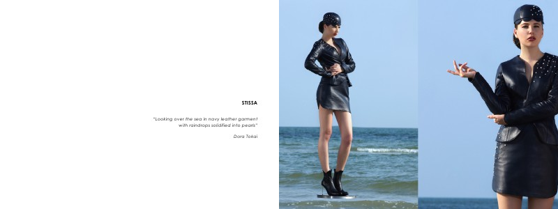 STISSA “Looking over the sea in navy leather garment with raindrops solidified into pearls” Dora Tokai