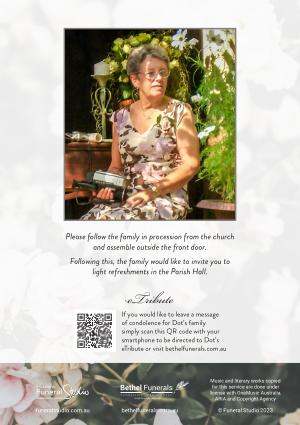If you would like to leave a message of condolence for Dot ’ s family simply scan this QR code with your smartphone to be directed to Dot ’ s eTribute or visit bethelfunerals . com . au