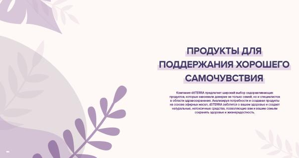 Компания dōTERRA предлагает широкий выбор оздоравливающих продуктов , которые завоевали доверие не только семей , но и специалистов в области здравоохранения . Анализируя потребности и создавая продукты на основе эфирных масел , dōTERRA заботится о вашем здоровье и создает натуральные , нетоксичные средства , позволяющие вам и вашим семьям сохранять здоровье и жизнерадостность .
