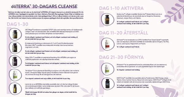 Behöver du hjälp med att veta var du ska börja ? dōTERRAs 30-dagars cleanse är en utmärkt startpunkt för din dōTERRA-resa . Upplägget är uppdelat i tre faser : Aktivera , Återställ , Återuppbygg . Nedan följer en tidslinje som visar vilka produkter som ska användas under hela upplägget ( dag 1 – 30 ) och vilka produkter som ska tas under varje fas . När du blir mer bekant med produkterna kan du anpassa upplägget så att det uppfyller dina specifika behov .