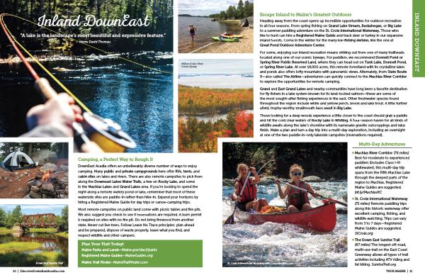 DownEast Acadia offers an unbelievably diverse number of ways to enjoy camping . Many public and private campgrounds here offer RVs , tents , and cabin sites on lakes and rivers . There are also remote campsites to pick from along the Downeast Lakes Water Trails , a few on Rocky Lake , and some in the Machias Lakes and Grand Lakes area . If you ’ re looking to spend the night along a remote watery pond or lake , remember that most of these waterside sites are paddle-in rather than hike-in . Expand your horizons by hiring a Registered Maine Guide for day trips or canoe-camping trips .