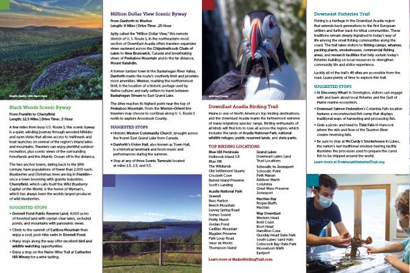 A few miles from busy U . S . Route 1 , this scenic byway is a quiet , winding journey through wooded hillsides and open vistas that allows access to trailheads and boat launches on several of the region ’ s inland lakes and mountains . Travelers can enjoy plentiful outdoor recreation , plus scenic views of the surrounding forestlands and the Atlantic Ocean off in the distance .