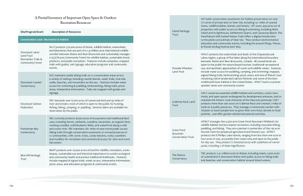 IHT holds conservation easements for habitat preservation on over 771 acres of private land on Deer Isle , including 13 + miles of coastal shore , wildlife habitat , islands , and forests . IHT owns 459 acres on 18 properties with public access to hiking & swimming , including Mark Island and its lighthouse , Settlement Quarry , and Causeway Beach . The DeeriNature Self-Guided Nature Trails offers a digital introduction to the plants and animals of Deer Isle . They conduct environmental education and community events , including the annual Wings , Waves , & Woods birding festival each May .