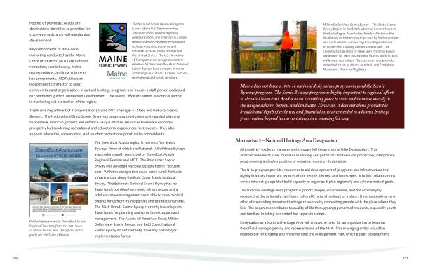 The DownEast Acadia region is home to five Scenic Byways , three of which are National . All of these Byways are predominantly promoted by DownEast Acadia Regional Tourism and MOT . The Bold Coast Scenic Byway was awarded National designation in February 2021 . With this designation could come funds for basic infrastructure along the Bold Coast Scenic National Byway . The Schoodic National Scenic Byway has no State funds but does have good infrastructure and a solid volunteer management team able to raise minimal project funds from municipalities and foundation grants . The Black Woods Scenic Byway currently has adequate State funds for planning and some infrastructure and management . The Acadia All-American Road , Million Dollar View Scenic Byway , and Bold Coast National Scenic Byway do not currently have any planning or implementation funds .