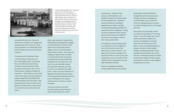 The region has a long-standing culture of sustainable resource management due to the economic and survival dependence on intact resources . The large scale of resource management in Downeast Maine can , and in some cases already does , serve as a model for other similarly resource dependent areas and offer leadership nationally . preservation ; commercial fisheries management and access ; open space , farming , and forestry management on private lands ; access to land and water for hunting , fishing , and outdoor recreation ; heritage tourism ; and heritage education .