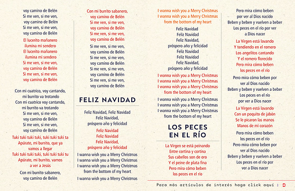 Pero mira cómo beben por ver al Dios nacido Beben y beben y vuelven a beber Los peces en el río por ver a Dios nacer La Virgen está lavando Y tendiendo en el romero Los angelitos cantando Y el romero florecido Pero mira cómo beben los peces en el río Pero mira cómo beben por ver al Dios nacido Beben y beben y vuelven a beber Los peces en el río por ver a Dios nacer La Virgen está lavando Con un poquito de jabón Se le picaron las manos Manos de mi corazón Pero mira cómo beben los peces en el río Pero mira cómo beben por ver al Dios nacido Beben y beben y vuelven a beber Los peces en el río por ver a Dios nacer