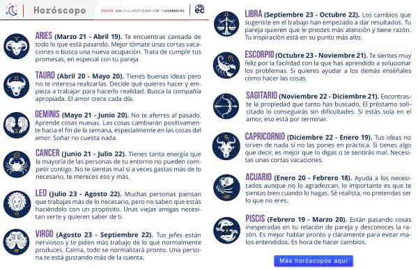 Horóscopo ARIES ( Marzo 21 - Abril 19 ). Te encuentras cansada de todo lo que está pasando . Mejor tómate unas cortas vacaciones o busca una nueva ocupación . Trata de cumplir tus promesas , en especial con tu pareja .
