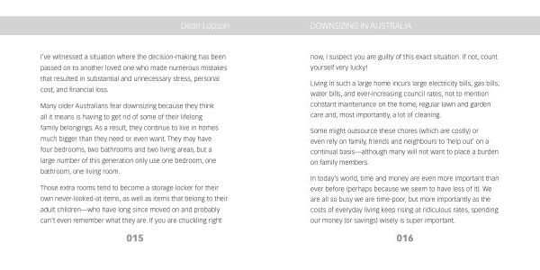 Many older Australians fear downsizing because they think all it means is having to get rid of some of their lifelong family belongings . As a result , they continue to live in homes much bigger than they need or even want . They may have four bedrooms , two bathrooms and two living areas , but a large number of this generation only use one bedroom , one bathroom , one living room .
