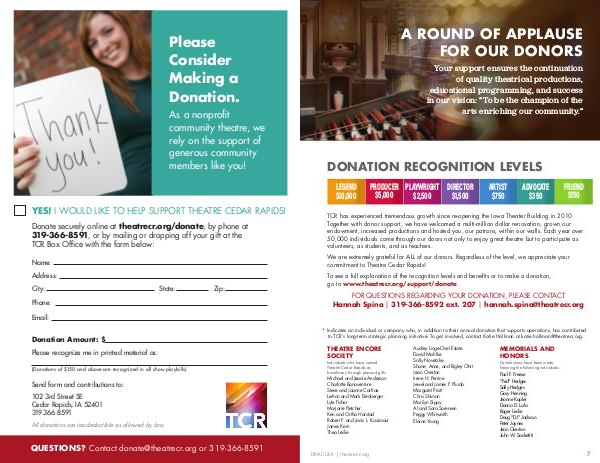 Please Consider Making a Donation. As a nonprofit community theatre, we rely on the support of generous community members like you! YES! I WOULD LIKE TO HELP SUPPORT THEATRE CEDAR RAPIDS! Donate securely online at theatrecr.org/donate, by phone at 319-366-8591, or by mailing or dropping off your gift at the TCR Box Office with the form below: Name: Address: City: State: Zip: Phone: Email: Donation Amount: $ Please recognize me in printed material as: (Donations of $150 and above are recognized in all show playbills) Send form and contributions to: 102 3rd Street SE Cedar Rapids, IA 52401 319.366.8591 All donations are tax-deductible as allowed by law. QUESTIONS? Contact or 319-366-8591 319-366-8591 QUESTIONS? Contact: donate@theatrecr.org boxoffice@theatrecr.org or