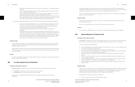 CRITERIA FOR QUALIFICATION Two points of credit may be given for radon-resistant construction in any radon zone. Construction must be in accordance with EPA best practices for Radon Resistant Construction for New Constructions. For credit, complete all of the following: ? ? ? ? ? ? ? Lay a perforated pipe (with a minimum diameter of four inches) in a four- to six-inch continuous layer of coarse gravel under the foundation slab. Place a layer of continuous, sealed plastic sheeting (6 mm) over the gravel. Connect the horizontal perforated pipe(s) to a solid pipe(s) running vertically to the attic and through the roof for passive sub slab/membrane depressurization. Seal all penetrations or cracks in the slab, foundation, or crawlspace floor with caulk or adhesive sealant. Provide an electrical receptacle in the attic or outside the building for the future installation of a fan (for active depressurization). Test for radon after construction. This test can occur prior to occupancy or after occupancy. The test must be completed by a Certified Tester as identified on the CDPH website. If the test results are greater than 4 picocuries per liter (pCi/L), install a continuously fan for active depressurization.