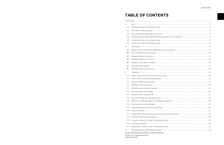 Introduction ................................................................................................................................................................... 1 A. Site .................................................................................................................................................................. 3 A1. Job Site Construction Waste Diversion ...........................................................................................................3 A2. Recycled Content Aggregate ...........................................................................................................................4 A3. Heat Island Effect Reduction (Non-Roof) .......................................................................................................5 A4. Construction Environmental Quality Management Plan Is Conducted ...........................................................6 A5. Stormwater Control: Prescriptive Path ............................................................................................................8 A6. Stormwater Control: Performance Path...........................................................................................................9 B. Foundation..................................................................................................................................................... 11 B1. Moisture Source Verification Identification and Correction .........................................................................11 B2. Fly Ash and/or Slag in Concrete ...................................................................................................................12 B3. Radon-Resistant Construction .......................................................................................................................13 B4. Foundation Drainage System ........................................................................................................................14 B5. Moisture Controlled Crawlspace ...................................................................................................................15 B6. Structural Pest Controls .................................................................................................................................15 B7. Pest Inspection and Correction ......................................................................................................................16 C. Landscape ...................................................................................................................................................... 18 C1. Plants Grouped by Water Needs (Hydrozoning) ...........................................................................................18 C2. Three Inches of Mulch in Planting Beds .......................................................................................................19 C3. Resource Efficient Landscapes......................................................................................................................19 C4. Minimal Turf in Landscape ...........................................................................................................................21 C5. High-Efficiency Irrigation Systems ...............................................................................................................21 C6. Soil Amended with Compost ........................................................................................................................23 C7. Rainwater Harvesting System .......................................................................................................................23 C8. Recycled Wastewater Irrigation System........................................................................................................24 C9. Submeter or Dedicated Meter for Landscape Irrigation ................................................................................24 C10. Landscape Meets Water Budget ....................................................................................................................25 C11. Environmentally Preferable Site Materials....................................................................................................26 C12. Exterior Lighting ...........................................................................................................................................27 C13. Certification Through Landscape Program Through Third Party..................................................................28 C14. Fire-Safe Landscaping Techniques ...............................................................................................................29 C15. Compost and Recycle Garden Trimmings On Site........................................................................................30 C16. Community Garden .......................................................................................................................................30 C17. Maintenance Contract with Certified Professional ........................................................................................31 D. Structural Frame and Building Envelope ...................................................................................................... 32 i
