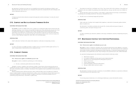 CRITERIA FOR QUALIFICATION Two points of credit is available for the active, regular use of a backyard compost bin for food wastes and landscape trimmings. A new bin does not preclude the homeowner from achieving this measure but it must be installed and used prior to completion of the rating. Utilizing the green bin provided by the local (municipal) waste authority for weekly pickup of yard and kitchen scraps does not meet this requirement. Worm composting bins may also help in meeting the requirements of this measure, but do not replace the need for a yard trimmings compost bin, unless there is no yard landscaping. VERIFICATION Field Verification: The Rater will conduct field compliance verification of composting activities. INTENT To reduce the burden on landfills and utilize available resources to promote healthier plants and trees. To reduce transportation of materials that can be composted on site.