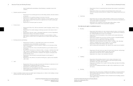 The following list applies to multifamily projects: ? Roofing: – – – – – – – ? Attic: – – – ? Cladding: – – – – ? Flashing: – – – Requirement: The intersections of different wall claddings are properly flashed. Ideal Conditions/Recommendation: Windows and doors have head flashing, especially lower floors. Ideal Conditions/Recommendation: Deck is flashed between building and deck at the ledger or joists. 35 Requirement: Wood siding material is not in contact with grade or soil. Requirement: Cladding is in good condition with minimal paint peeling, degradation, and cracks, and no bulging. Requirement: Cladding is free of gaps or missing siding exposing the sheathing or interior space. Requirement: Cladding penetrations are tight, with no significant use of caulk for closure. Requirement: The attic shows no signs of current water intrusion, and openings to the exterior are properly flashed, sealed, and screened. Requirement: The attic has clear ventilation pathways. Requirement: No exhaust vents terminate in the attic. Requirement: Roof gutters are clean, properly pitched to drain, well connected, and supported at the roof eaves. (Note: gutters are not required to be installed if the existing building does not have any installed.) Requirement: The roof assembly is free of debris (such as plant debris from nearby trees). Requirement: Sloped roofs do not have missing, peeling, or degraded shingles. Flat roofs do not have significant blistering or ponding. Requirement: The roof line, fascia, and soffit do not sag. Requirement: Roof penetrations (such as valleys, vent pipes, fans, drip edge, chimneys, skylights, fascia, roof overhangs, etc.) are flashed. Requirement: Exhaust and chimney flues are capped. Ideal Conditions/Recommendation: The chimney has a spark arrestor installed.