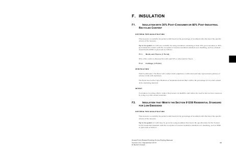 CRITERIA FOR QUALIFICATION This measure is available for partial credit based on the percentage of insulated walls that meet the specific criteria of the measure. Up to two points of credit are available for using insulation containing at least 30% post-consumer or 60% post-industrial content (with the exception of exterior insulation installed over sheathing, such as oriented strand board (OSB) or plywood) as follows: F1.1. Walls and Floors (1 Point)