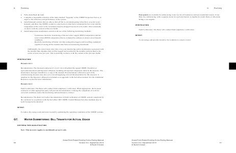 Additionally, the owner must enter into a two-year monitoring and/or maintenance agreement with the installer that stipulates data will be logged and recorded by the installer and provided to the owner at least once per year. This is mutually exclusive with the content of the previous bullet. VERIFICATION Measure G6.1 Documentation: The licensed contractor (C-4 or C-36) will submit the signed CDHW Checklist or equivalent document and Operator’s Manual, including all required components listed in the measure. The maintenance manager should have a copy of the manual. Documentation collected as part of the commissioning measure may also serve toward supplying relevant documentation for this measure. A template for the Operator’s Manual is included as an appendix in the SoCalGas manual; See the Additional Resources section for more information. Measure G6.2 Field Verification: The Rater will conduct field compliance verification. When appropriate, the licensed contractor or other appropriate party will provide documentation verifying the completion of work for corrected conditions and/or the monitoring and maintenance contract. Documentation: The Rater will collect documentation of field verification of CDHW controls completed by the contractor in accordance with the SoCalGas’ MF CDHW Control Manual, but other methods may be used if properly documented. INTENT To reduce the energy used and water wasted by optimizing the operating conditions of the CDHW systems.