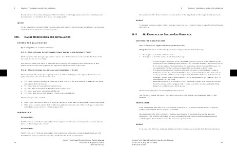 VERIFICATION Measure H10.1 Field Verification: The Rater will conduct field compliance verification of venting to the exterior and take photos of the ducting to the exterior. Measure H10.2 Field Verification: The Rater will conduct field compliance verification of capture hood alignment with front burners, presence of the recessed fan, and that the fan meets specifications. GreenPoint Rated Existing Home Rating Manual Version 6.0, September 2013 © Build It Green