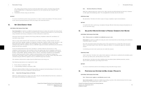 CRITERIA FOR QUALIFICATION Up to four points of credit are available for designing the home(s) to reduce the need for site energy based on annual energy use. The calculations are based on energy consumed and generated over a one-year period using calculations and energy assumptions of a home and typical occupant uses. This project must meet the California 2013 Energy Efficiency Standards without the contributions of renewable energy offsets. End use energy loads included in the calculations are as follows: heating, cooling, domestic hot water, interior and exterior lighting, appliances (refrigerator, dishwasher), laundry (clothes washe r and dryer ), and plug loads (based on home computer and entertainment center). Assumptions for plug loads will be calculated using 2009 Pier Appliance Survey or RESNET plug load calculator and built into the GreenPoint Rated Near/Net Zero calculator. Use the GreenPoint Rated Near/Net Zero calculator to calculate offset for the measures to verify compliance with this measure. This calculator will use the outputs from Title 24 compliance software for heating, cooling, and domestic hot water. End use energy loads included in the calculations are as follows: heating, cooling, DHW, lighting (including interior, exterior, and parking and hallways for multifamily projects), plug loads (based on home computer and entertainment center), appliances (refrigerator, dishwasher), and laundry (clothes washer and dryer differentiated by in unit and central). Plug loads will be calculated using the 2009 Pier Appliance Survey or RESNET plug load calculator. The calculator will provide an output of percent offset based on site energy use. The following equivalencies are recognized for credit: ? ? Passive House Certification: TBD Living Building Challenge certification: TBD