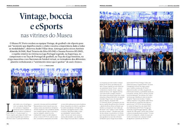 parte deste FC Porto Vintage. A eles uma palavra de apreço e agradecimento. Só assim conseguimos colocar em campo aquilo que é o ADN e a mística do FC Porto”. Depois de receber os troféus na galeria da história azul e branca, o presidente saudou as“ conquistas, vitórias, títulos, esforço e muitas horas de dedicação” dos atletas e de“ toda a estrutura que trabalha por estes momentos de glória”. Depois de recordar o“ triplete inédito e histórico” do goalball, André Villas- Boas abordou as conquistas dos eSports e garantiu que“ o FC Porto honrará sempre os nomes do Diogo Jota e do André Silva”. Aos futebolistas do FC Porto Vintage que venceram a Liga Portugal Legends, o líder máximo do clube pediu“ muitos mais troféus” e deixou um agradecimento sentido:“ O vosso esforço é contagiante, a idade não passa por vocês e continuam com a mesma vontade de dignificar a camisola do FC Porto”.