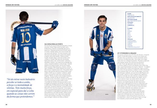 DA CATALUNHA AO PORTO Foi aos três anos que Pol Manrubia descobriu o hóquei em patins. Numa“ aldeia muito humilde”, perto de Barcelona, conheceu a modalidade pela qual se apaixonou.“ Algumas pessoas foram lá tentar captar os miúdos. Quando acabou o dia, disse à minha mãe que queria experimentar”. Foi nesse momento e por mero acaso que descobriu que o pai já tinha calçado os patins, mas a nível amador. O destino estava traçado. Quando chegou a altura de escolher entre o hóquei e o futebol, Manrubia não teve dúvidas.“ Optei pelos patins, são a minha paixão”, sublinhou. Desafiado a explicar o que separa esta modalidade das outras, o hoquista enalteceu o ritmo de jogo.“ Quando alguém vê um jogo de hóquei, tem de estar sempre atento, porque é adrenalina pura, contacto, visão de jogo e inteligência. É o melhor desporto do mundo”. A esta certeza, o espanhol junta outra.“ Ser guarda-redes? Nunca. Acho que eles têm de ser malucos para ir para a baliza. Prefiro ser eu a rematar”, confessou. Sendo assim, o que significa o golo para o camisola 10 dos Dragões?“ Marcar um golo é uma sensação fantástica para todo o mundo e eu não sou exceção, é uma satisfação enorme. No entanto, só penso em contribuir com o que posso para a equipa, desde a minha intensidade até à dinâmica de jogo que ajudo a criar”. A chegada ao bicampeão nacional deu-se neste verão e, desde então, Pol Manrubia já se sente Dragão. Entre todos esses“ momentos especiais”, a primeira visita ao Museu FC Porto não ficou esquecida.“ Como atletas, somos uma pequeníssima parte da história do FC Porto, que é fantástica. A capacidade de superação do clube é extraordinária e é um clube vencedor. Ganhou muito mais do que perdeu e isso é algo muito complicado de fazer para qualquer instituição. A nível pessoal, quero entregar o máximo de troféus ao Museu”.