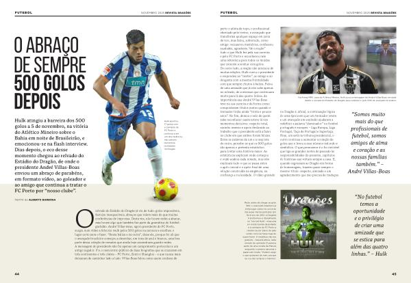 NOVEMBRO 2025 REVISTA DRAGÕES perto o atleta de topo, o profissional obcecado pelo treino, o avançado que transforma qualquer espaço em zona de tiro, mas falou, sobretudo, como amigo: recuperou memórias, confessou saudades, agradeceu“ de coração” tudo o que Hulk fez pela sua carreira e pelo FC Porto e reconheceu nele uma referência para todos os miúdos que crescem a sonhar com golos. Do outro lado, a reação não precisou de muitas edições. Hulk ouviu o presidente e respondeu ao“ mister”, ao amigo e ao dirigente com a mesma frontalidade com que sempre chutou à baliza. Falou de uma amizade que já não cabe apenas no relvado, de conversas que continuam muito para lá das quatro linhas, da importância que André Villas-Boas teve na sua carreira e da forma como conquistaram títulos juntos quando o treinador tinha ainda“ trinta e poucos anos”. No fim, deixou o selo de quem sabe reconhecer quem esteve lá nos momentos decisivos: respeito total, carinho imenso e apoio declarado ao trabalho que o presidente está a fazer no clube em que ambos foram felizes. Entre as palavras de um e a resposta do outro, percebe-se que os 500 golos são apenas o pretexto estatístico para contar uma história maior. As estatísticas explicam onde começou e onde acabou cada remate, mas não explicam tudo o que se passa entre o apito inicial e o apito final de uma relação construída na exigência, na confiança e na lealdade. O vídeo gravado