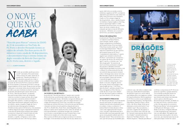 ÍDOLO DE GERAÇÕES A antestreia de“ Nascido para Marcar”, no Auditório José Maria Pedroto, juntou Direção, família, amigos, antigos companheiros e treinadores de Fernando Gomes. Foi aí que André Villas-Boas resumiu aquilo que o filme se encarrega de desenvolver:“ Não há nada mais maravilhoso do que a história de Fernando Gomes no FC Porto.” O presidente do clube lembrou“ o quarto jogador mais utilizado na história do FC Porto”, um homem que“ conquistou um número de títulos e de vitórias sem igual” e que foi, e continua a ser,“ um ídolo de gerações”. Na memória de muitos portistas, permanece a imagem dos pequenos calendários de bolso religiosamente guardados na carteira, com o número 9 e as duas Botas de Ouro de um ponta de lança que parecia renascer todos os domingos para marcar outra vez. Mas Fernando Gomes foi muito mais do que um goleador. Depois de terminar a carreira de jogador, continuou a servir o clube em várias funções: sócio desde os seis anos, dirigente, diretor de scouting, diretor da formação e três vezes Dragão de Ouro.“ O FC Porto deve-lhe muito”, sublinhou André Villas- Boas, entregando ao filho, Martim, o cartão de sócio do pai como símbolo de uma vida inteira ligada ao emblema que vestiu dentro e fora de campo.
