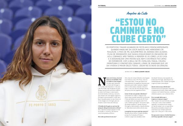 OS PORTISTAS TINHAM ACABADO DE FESTEJAR O PENTACAMPEONATO QUANDO ANGELINE DA COSTA NASCEU NOS ARREDORES DE TOULOUSE, A MAIS DE MIL QUILÓMETROS DA AVENIDA DOS ALIADOS. FILHA DE EMIGRANTES QUE NUNCA ESQUECERAM OS ENCANTOS DO AZUL E BRANCO, NÃO TARDOU A RENDER-SE ÀS CORES LÁ DE CASA E A DESENVOLVER UMA PAIXÃO QUE NEM A DISTÂNCIA FOI CAPAZ DE ESMORECER. COM A BOLA NO PÉ, ESPALHOU MAGIA, CRUZOU FRONTEIRAS E CONCRETIZOU SONHOS, LONGE DE IMAGINAR QUE UM DIA VIVERIA O MAIOR DELES TODOS: JOGAR NO ESTÁDIO DO DRAGÃO.