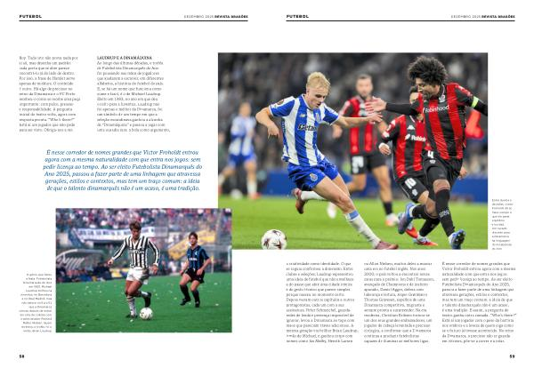Entre duelos e decisões, Victor Froholdt dá ao meio-campo o que ele pede: equilíbrio e lucidez. Um recado discreto para a Dinamarca na linguagem do Futebolista do Ano. a criatividade como identidade. O que se seguiu confirmou a dimensão. Entre clubes e seleções, Laudrup representou uma ideia de futebol que não envelhece: a do passe que abre uma cidade inteira e do gesto técnico que parece simples porque nasceu no momento certo. Depois vieram outros capítulos e outros protagonistas, cada um com a sua assinatura. Peter Schmeichel, guardaredes de lenda e presença impossível de ignorar, levou a Dinamarca ao topo com mãos que pareciam traves adicionais. A mesma geração viu brilhar Brian Laudrup, irmão de Michael, e ganhou corpo com nomes como Jan Mølby, Henrik Larsen ou Allan Nielsen, muitos deles a marcar uma era no futebol inglês. Nos anos 2000, o país voltou a encontrar novas caras para o prémio: Jon Dahl Tomasson, avançado de Champions e de instinto apurado, Daniel Agger, defesa com liderança e leitura, Jesper Grønkjær e Thomas Gravesen, espelhos de uma Dinamarca competitiva, migrante e sempre pronta a surpreender. Na era moderna, Christian Eriksen tornou-se um dos seus grandes embaixadores, um jogador de cabeça levantada e precisão cirúrgica, a confirmar que a Dinamarca continua a produzir futebolistas capazes de iluminar as melhores ligas.