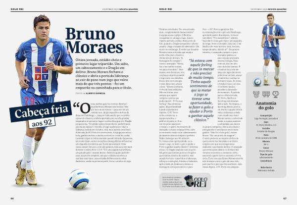 “ Ficámos revoltados. Foi uma entrada dura, completamente desnecessária”. A equipa acusa o golpe. O Benfica reorganiza-se, alonga o jogo, trava o ímpeto portista e reduz. Mais perto do fim, quando o Dragão preparava o último assalto, chega o empate do adversário. Um murro no estômago. É então que Jesualdo Ferreira toma a decisão que muda a noite: olha para o banco e chama Bruno Moraes.“ A mensagem foi simples”, conta o avançado.“ Entra, faz o teu melhor miúdo, vai para cima deles”. Sem mapas, sem discursos, só a confiança importa quando o jogo entra nos detalhes. Bruno leva nova energia e uma ideia clara: atacar a área.“ Estava confiante, vinha de boas exibições. Não era titular, mas sempre que jogava cumpria e sentia que podia decidir. Tinha esse feeling”. Nas primeiras ações, dá profundidade e pede cruzamentos rápidos. O FC Porto volta a empurrar, a equipa acredita, o público levanta-se. E ao cair do pano aparecem o tempo e o gesto: movimento do avançado a atacar o espaço livre, salto no momento exato e um cabeceamento de desenho técnico simples e perfeito. Rede a balançar aos 92 minutos.“ Se tivesse uma oportunidade, eu ia matar o jogo, ia fazer o golo e ajudar o Porto a ganhar aquele clássico”, sintetiza Bruno. O Dragão explode num só grito. Há golos que somam pontos e há golos que mudam estados de espírito, mas aquele fez tudo: consolidou a liderança, reforçou convicções, blindou o balneário após a lesão de Anderson e deixou a mensagem certa para dentro e para fora – o FC Porto joga até ao fim. A comparação com o golo em Hamburgo, apontado quatro dias depois, torna-se inevitável.“ Foi maravilhoso”, admite,“ mas não é o meu golo típico: pé esquerdo, de longe, forte e colocado. Saiu-me. O do Benfica diz mais de mim: área, instinto, tempo de salto, decidir ali”. Em poucos minutos, o avançado cumpriu o que o treinador pedira e o que a equipa precisava: