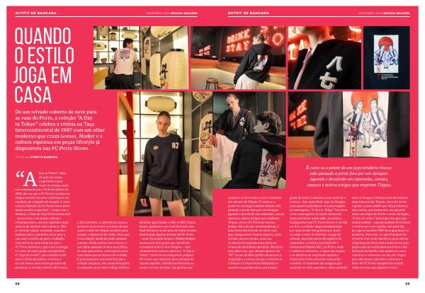 detalhes que piscam o olho a 1987, frases, datas e grafismos que transformam uma final histórica numa peça de todos os dias. Misturando figuras eternas do FC Porto – como Fernando Gomes e Rabah Madjer, autores dos dois golos que decidiram o encontro a favor dos Dragões – com elementos da cultura nipónica,“ A Day in Tokyo” constrói um imaginário próprio. Há traços que remetem para cartazes de cinema japonês, referências discretas ao nevão e ao ano da final, tipografias que