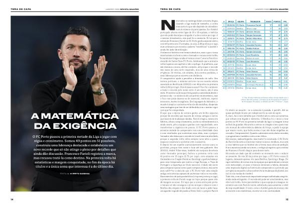 foi direto ao assunto- se a camisola é puxada, é penálti. Até na quase-perfeição houve um rodapé escrito ao som do apito. E, claro, há o outro detalhe que o futebol adora como as narrativas que voltam com bigode e memória. O Benfica foi o único a tirar pontos ao FC Porto na primeira metade da liga e a imagem tornase fácil de guardar: Mourinho a entrar no Dragão como quem traz um manual de sobrevivência debaixo do braço, a pedir à equipa que respire curto, que feche portas e que não deixe migalhas no corredor. Compreensível. Quando o adversário está a bater recordes, o pragmatismo também conta como tática. Em resumo, nada está ganho, mas muito foi construído. O FC Porto de Farioli não está a colecionar números para a moldura, mas está a criar hábitos que no futebol são a forma mais séria de ambição. E se a maratona ainda vai a meio, o relógio já registou que a estreia de Francesco Farioli chegou para deixar rasto. Há ainda um dado que dá contexto ao momento sem o reduzir ao presente. No top 20 de pontos por jogo, o FC Porto ocupa 12 lugares, deixando apenas oito para Benfica, Sporting e Braga. Do rigor metódico de outras eras às equipas que aprenderam a vencer com maturidade, os azuis e brancos dominam a tabela, deixando uma impressão digital na história do campeonato e a prova de que a exigência enquanto cultura sobrevive às mudanças de plantel, aos ciclos e às modas do futebol. Tudo isto, com a frase mais importante sempre sublinhada a negrito: ainda nada está ganho. O recorde até pode ser uma bandeira, mas não é um troféu. Serve para lembrar o que a equipa já conseguiu no primeiro ano com Farioli e serve, sobretudo, para aumentar o nível de responsabilidade. O resto, como o futebol gosta de ensinar, não se escreve com estatísticas, escreve-se com continuidade.