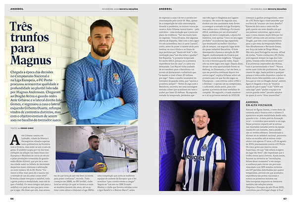 FEVEREIRO 2026 REVISTA DRAGÕES do regresso a casa e de ver a carreira ser interrompida pelo covid-19. Mas, apesar de a competição ter sido interrompida durante a pandemia, os treinos nunca pararam e Ante Grbavac nunca travou – pelo contrário – uma evolução que o poria em plano de evidência.“ Saí-me muito bem no regresso. Tinha 23 anos, tive algumas ofertas de Espanha, falei com o meu agente e ele aconselhou-me a ir para Cuenca”, conta, antes de puxar a cassete atrás para lembrar os cinco títulos e as finais de taça perdidas que“ doem até hoje” e dão motivação para“ um dia voltar e ganhar”. Em Espanha,“ a primeira temporada foi muito difícil, porque era a primeira experiência fora de casa”, e o peso era demasiado. Leo Maciel tinha acabado de se transferir para o Barcelona e os jornais só destacavam o substituto que“ ia manter o nível e fazer 20 defesas por jogo”. Valeu o auxílio incansável do treinador de guarda-redes, que“ apoiou e acreditou sempre”:“ Antes do jogo com o Benidorm, escreveu-me uma mensagem sentida a dizer que acreditava em mim e acabei por fazer 23 defesas. Na segunda metade da temporada, perdemos apenas três jogos e chegámos aos lugares europeus. No início do segundo ano, éramos uns dos candidatos mais fortes a conseguir a entrada na Liga Europeia, mas calhou-nos o Silkeborg e foi muito difícil, acabámos por ser eliminados”. Apesar do início complicado, a época foi histórica, com apenas“ cinco ou seis jogos perdidos” na poderosa liga espanhola que resultaram na melhor classificação de sempre, um segundo lugar atrás do quase imbatível Barcelona. O bom desempenho chamou a atenção do RK Zagreb, multicampeão da Croácia que requeria ainda mais exigência.“ Cheguei lá e era o terceiro guarda-redes, fiquei oito ou nove jogos sem jogar. Depois disso, deram-me uma oportunidade frente ao Aalborg, na Dinamarca, e saí-me bem, o que me permitiu continuar depois nos outros jogos”, explica Grbavac sobre um primeiro ano em que fez dez jogos na Champions – com vitórias sobre o PSG e o Kolstad – e apenas um no campeonato, o suficiente, ainda assim, para conquistar a primeira de duas medalhas de campeão. No segundo, a toada manteve--se e só na primeira metade de 2025 / 26 começou a ganhar protagonismo, antes de o FC Porto ligar e Ante perceber que era hora de“ encarar um novo desafio”.“ Estava há dois anos e meio em Zagreb, queria um novo desafio em que me pudesse concentrar, agora estou aqui e estou mesmo muito feliz por ter vindo”, afirma com um sorriso o novo Dragão, que tem como companheiros para o que resta da temporada Sebastian Abrahamsson e Bernardo Sousa, por força da lesão de Diogo Rêma. Não veio para Portugal às escuras. Afinal de contas,“ todos conhecem o FC Porto, pois jogaram sempre na Liga dos Campeões, tirando estes últimos dois anos”. E as primeiras impressões são ótimas,“ tudo é pormenorizado e bom”.“ Nunca estive num clube tão profissional. Se precisares de algo, basta pedires a qualquer pessoa e todos estão dispostos a ajudar-te. Estou muito feliz também com a atmosfera que se vive no Dragão Arena”, admite. Agora é chegada a hora de“ mostrar aquilo de que é capaz” e dar“ 100 % em cada jogo” para“ ajudar a equipa e os outros guarda-redes” perante adeptos de quem já ouviu“ dizer maravilhas”.