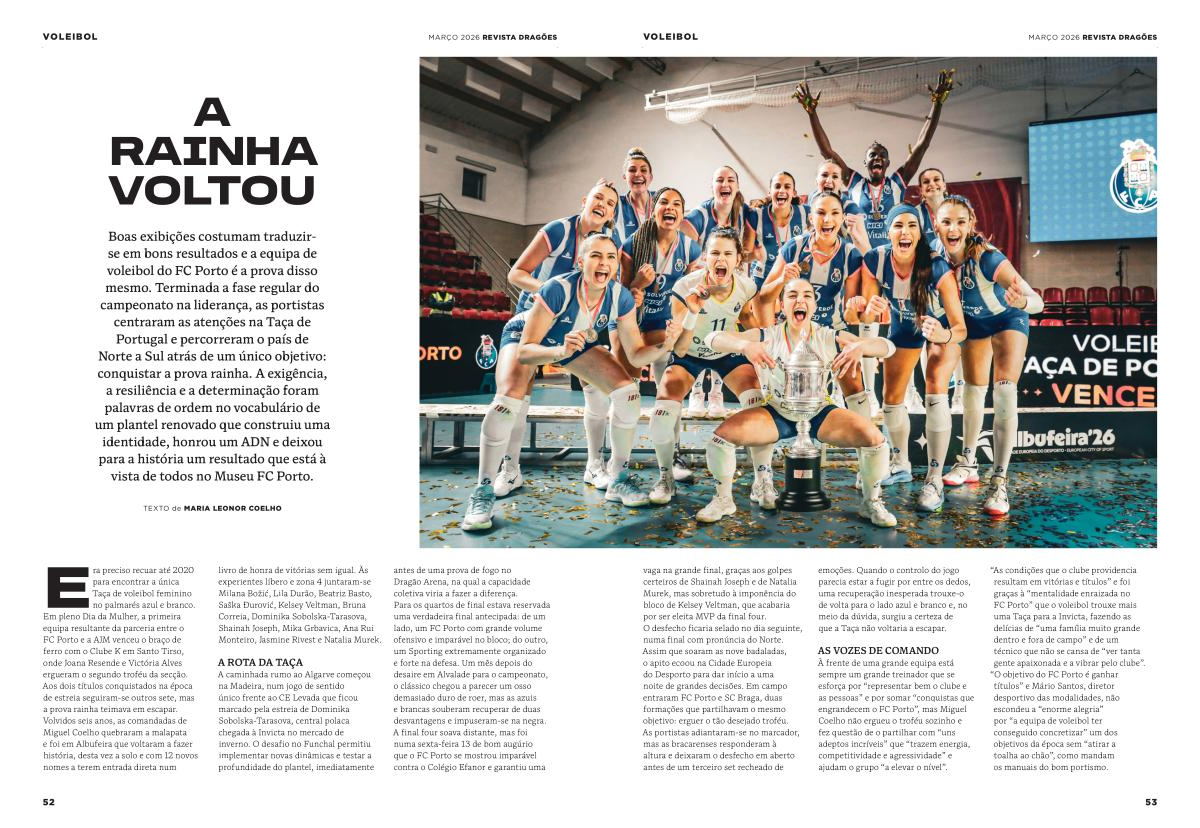 Era preciso recuar até 2020 para encontrar a única Taça de voleibol feminino no palmarés azul e branco. Em pleno Dia da Mulher, a primeira equipa resultante da parceria entre o FC Porto e a AJM venceu o braço de ferro com o Clube K em Santo Tirso, onde Joana Resende e Victória Alves ergueram o segundo troféu da secção. Aos dois títulos conquistados na época de estreia seguiram-se outros sete, mas a prova rainha teimava em escapar. Volvidos seis anos, as comandadas de Miguel Coelho quebraram a malapata e foi em Albufeira que voltaram a fazer história, desta vez a solo e com 12 novos nomes a terem entrada direta num livro de honra de vitórias sem igual. Às experientes líbero e zona 4 juntaram-se Milana Božić, Lila Durão, Beatriz Basto, Saška Đurović, Kelsey Veltman, Bruna Correia, Dominika Sobolska-Tarasova, Shainah Joseph, Mika Grbavica, Ana Rui Monteiro, Jasmine Rivest e Natalia Murek.