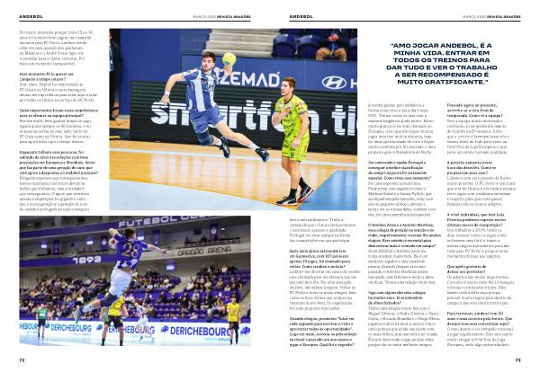 O António Areia e o Antonio Martínez, seus colegas de posição na seleção e no clube, respetivamente, teceram-lhe muitos elogios. Esse carinho é essencial para demonstrar mais à-vontade em campo? Já em 2022 / 23 o António Areia me tinha recebido muito bem. Ele é um excelente jogador e uma excelente pessoa. Quando cheguei cá no ano passado, o Antonio Martínez estava lesionado, mas falávamos muito e davame dicas. Temos uma relação muito boa.