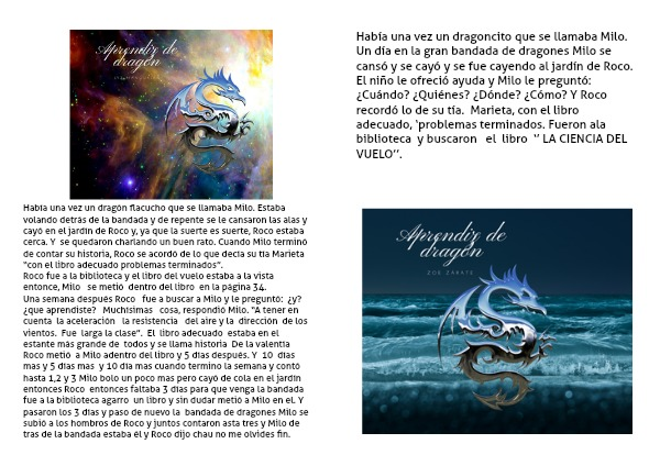 Había una vez un dragoncito que se llamaba Milo. Un día en la gran bandada de dragones Milo se cansó y se cayó y se fue cayendo al jardín de Roco. El niño le ofreció ayuda y Milo le preguntó: