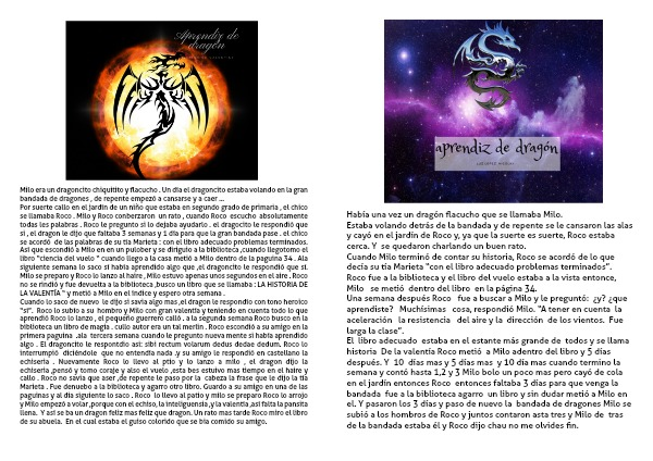 Cuando lo saco de nuevo le dijo si savia algo mas ,el dragon le respondío con tono heroico “sí”. Roco lo subío a su hombro y Milo con gran valentía y teniendo en cuenta todo lo que aprendió Roco lo lanzo , el pequeño guerrero calló . a la segunda semana Roco busco en la biblioteca un libro de magia . cullo autor era un tal merlin . Roco escondió a su amigo en la primera paguina .ala tercera semana cuando le pregunto nueva mente si había aprendido algo . El dragoncito le respontdio asi: sibi rectum volarum dedus dedae dedum. Roco lo interrumpió diciéndole que no entendía nada .y su amigo le respondió en castellano la echiseria . Nuevamente Roco lo llevo al ptio y lo lanzo a milo , el dragon dijo la echiseria ,pensó y tomo coraje y also el vuelo ,esta bes estuivo mas tiempo en el haire y callo . Roco no savia que aser ,de repente le paso por la cabeza la frase que le dijo la tía Marieta . Fue denuebo a la biblioteca y agarro otro libro. Guardo a su amigo en una de las paguinas y al dia siguiente lo saco . Roco lo llevo al patio y milo se preparo Roco lo arrojo y Milo empezó a volar ,porque con el echiso, la inteliguensia ,y la valentía ,así falta la pansita llena. Y así se ba un dragon feliz mas feliz que dragon. Un rato mas tarde Roco miro el libro de su abuela. En el cual estaba el guiso colorido que se bia comido su amigo.
