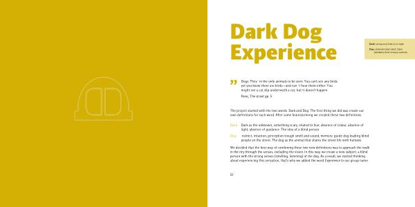 We decided that the best way of combining these two new definitions was to approach the walk in the city through the senses , excluding the vision . In this way , we create a new subject ; a blind person with the strong senses ( smelling , listening ) of the dog . As a result , we started thinking about experiencing this sensation , that ’ s why we added the word Experience to our group name .