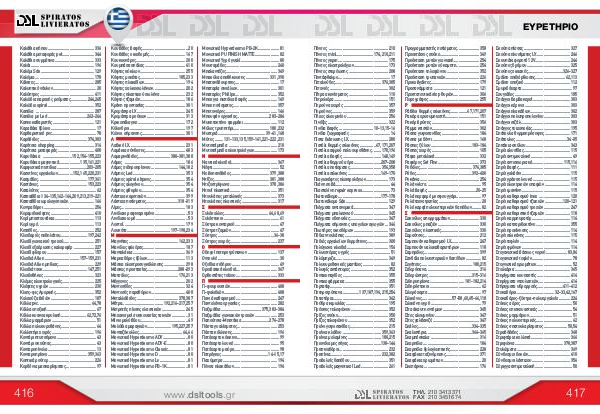 Μονωτικό Hyperdesmo PB-2K..................... 81 Μονωτικό PU FINISH MATTE........................ 82 Μονωτικό Υγρό γυαλί...................................... 80 Μουσαμάδες.................................................. 240 Μπαλαντέζες.................................................. 349 Μπαούλα αποθήκευσης........................ 331,390 Μπατανόβουρτσες........................................... 17 Μπαταρία σινιάλων....................................... 301 Μπαταρίες Philips......................................... 352 Μπεκ για πιστόλια βαφής............................. 149 Μπεκ ποτίσματος........................................... 357 Μπετονιέρες.................................................. 146 Μπουφάν εργασίας................................ 283-284 Μυκητοκτόνο φαρμάκι................................. 112 Μύλος τρυπητήρι.................................... 180,232 Μυστριά............................................... 39-41,168 Μύτες......... 131-133,135,159-161,221-222,231 Μυτοτσίμπιδα............................................... 210 Μυτοτσίμπιδα ηλεκτρολόγων...................... 173 Ν Ναυτικά κλειδιά............................................. 367 Νέφτι................................................................. 52 Νοβοπανόβιδες...................................... 379,388 Ντίζες....................................................... 381,388 Ντιζοστρίφωνα....................................... 378,386 Ντουί πλαστικά.............................................. 351 Ντουλάπες μεταλλικές.................................. 373 Ντουλάπες πλαστικές................................... 317 Ξ Ξυλόκολλες............................................ 64,68,69 Ξυλόστοκοι...................................................... 61 Ξύστρα κονταριού........................................... 47 Ξύστρα τζαμιών............................................... 47 Ξύστρες....................................................... 36-38 Ξύστρες χειρός.............................................. 237 Ο Οδηγοί ποτηροτρύπανων............................. 137 Οντουλέ............................................................ 30 Οξείδια σιδήρου.............................................. 49 Ορειβατικά κλειδιά........................................ 367 Ορθοστάτες τοίχου........................................ 333 Π Π-φουρουσιών.............................................. 408 Π-ψαλιδιών.................................................... 408 Πανιά καθαρισμού........................................ 247 Παντελόνια εργασίας.................................... 282 Παξιμάδια........................................ 375,383-384 Παξιμάδια γωνιακών τροχών...................... 253 Παπούτσια-Μποτάκια............................ 276-278 Πάστα γυαλίσματος....................................... 253 Πάστα κόλλησης............................................ 196 Πατόχαρτο κόκκινο......................................... 99 Πατόχαρτο λευκό............................................ 95 Πατόχαρτο μαύρο............................................ 98 Πατρόγκες.............................................. 14-15,17 Παχύμετρα..................................................... 194 Πένσα πλακάδων.......................................... 194