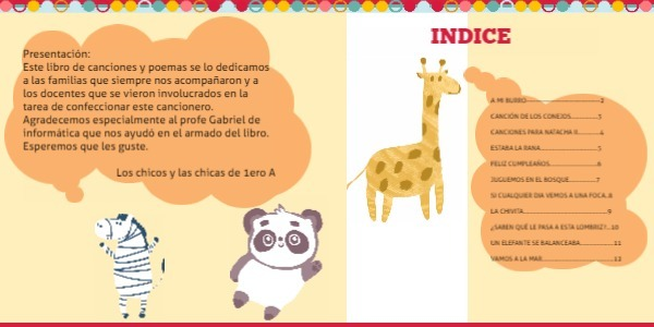Este libro de canciones y poemas se lo dedicamos a las familias que siempre nos acompañaron y a los docentes que se vieron involucrados en la tarea de confeccionar este cancionero. Agradecemos especialmente al profe Gabriel de informática que nos ayudó en el armado del libro.
