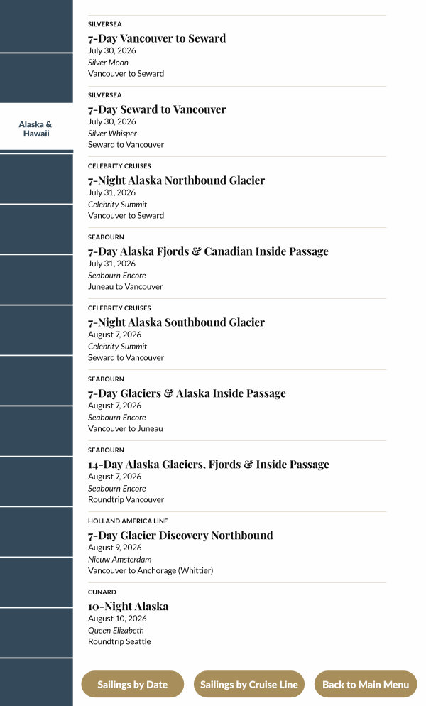 August 9, 2026 Nieuw Amsterdam Vancouver to Anchorage( Whittier)