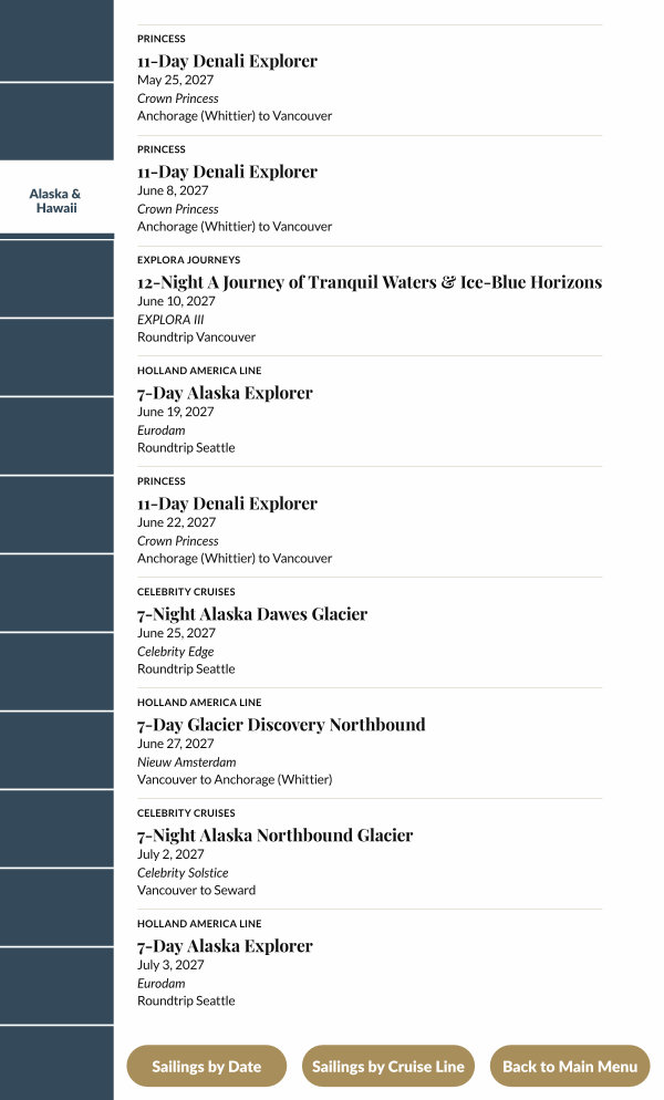 June 27, 2027 Nieuw Amsterdam Vancouver to Anchorage( Whittier)