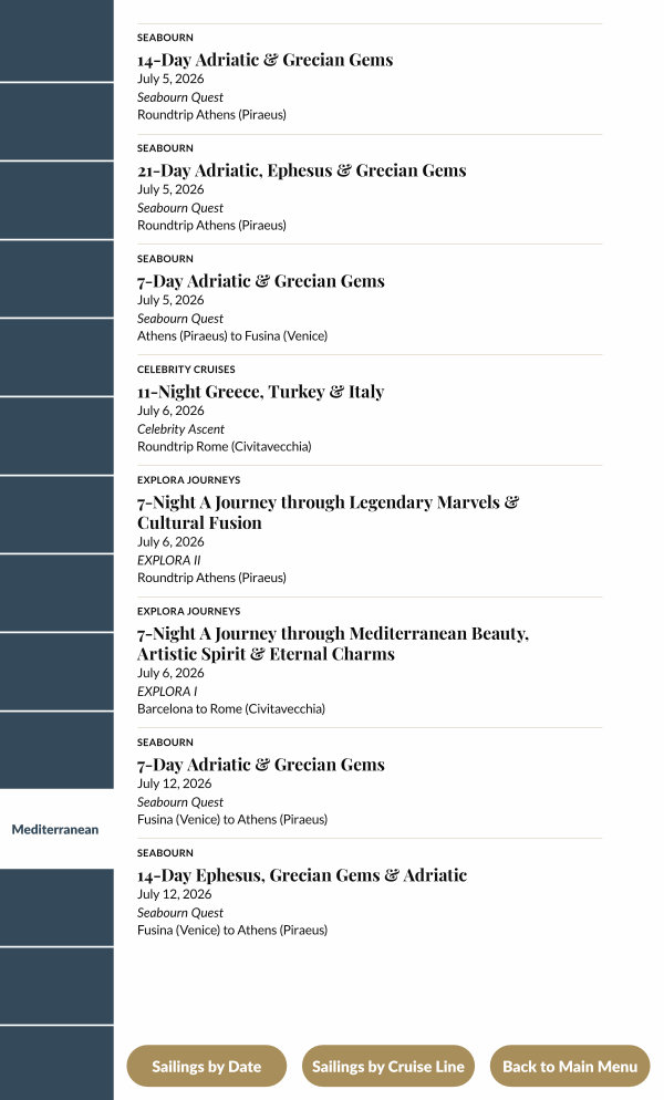 July 5, 2026 Seabourn Quest Athens( Piraeus) to Fusina( Venice)