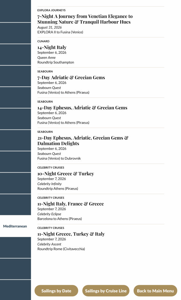 September 6, 2026 Seabourn Quest Fusina( Venice) to Athens( Piraeus)