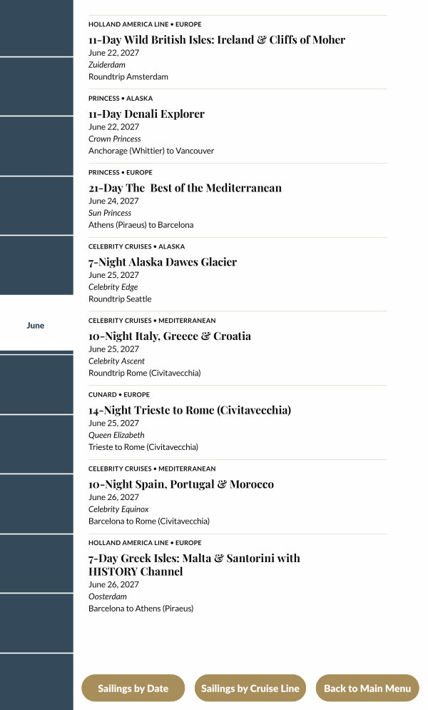 June 24, 2027 Sun Princess Athens( Piraeus) to Barcelona