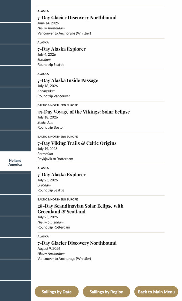 August 9, 2026 Nieuw Amsterdam Vancouver to Anchorage( Whittier)