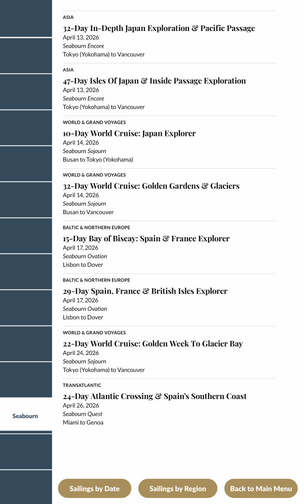 April 13, 2026 Seabourn Encore Tokyo( Yokohama) to Vancouver