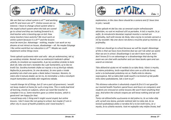 This distance education is absolutely stupid . At first it ' s not good for our mental health . Teachers spend hours and hours on computers and students are stressed on online lessons . We won ' t learn anything that way . And when the schools reopen , we will know nothing and we will fail . Tento rok dištančného vyučovania mi dal jedine to , že sa treba vždy učiť , aj keď sme doma , pretože niektoré deti to robia tak , že na testoch podvádzajú alebo si nerobia DÚ a to len kvôli tomu , že si myslia , že to učitelia nezistia . Vzal mi najlepšie roky môjho života , keď