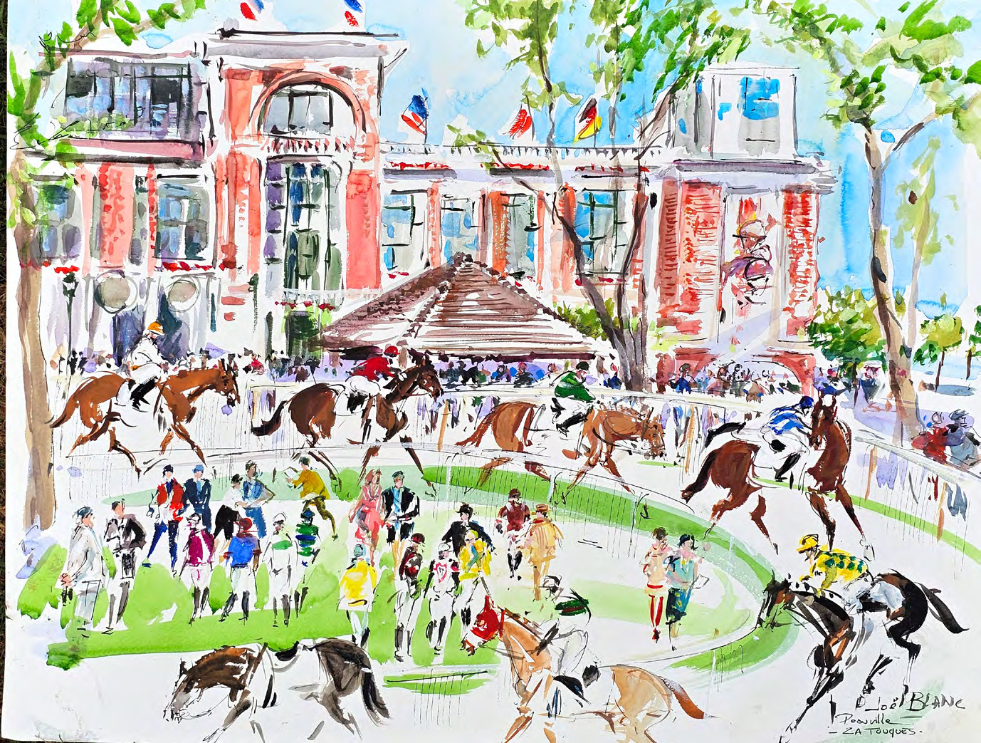 L’ambiance vibrante des courses avec le tumulte des spectateurs et les cris des parieurs vient animer et enrichir ses aquarelles. Il cherche à s’éloigner des représentations traditionnelles des chevaux, figées et en noir et blanc, pour proposer une vision moderne, colorée, joyeuse et positive. Ses voyages ont enrichi cette vision en découvrant des races insolites comme l’Akhal- Téké à la robe dorée. En parallèle de ses aquarelles, Joël Blanc réalise des huiles sur toile et des sculptures en bronze et a imaginé les chevaux du logo actuel du PMU, en restant fidèle à sa représentation du cheval en mouvement.