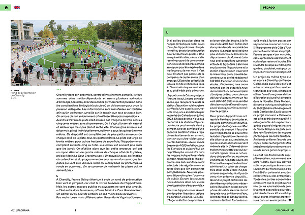 Un projet du même type est en cours à Chantilly, où France Galop, mais aussi des golfs et autres terrains sportifs ou services techniques des villes, aimeraient utiliser l’ eau d’ une grosse station d’ épuration aujourd’ hui déversée dans la Nonette. Clara Morvan, directrice technique et ingénieure du SAGE( Schéma d’ Aménagement et de Gestion des Eaux), soutient ce projet innovant. « Cette eau est déjà de très bonne qualité, il est regrettable de la rejeter alors qu’ elle pourrait irriguer les sites de France Galop ou les golfs, puis être réinfiltrée dans les nappes phréatiques de notre territoire. Au lieu de prélever l’ eau de ces napes, on les rechargerait! Mais la règlementation est encore très lourde sur ce genre de projet. »