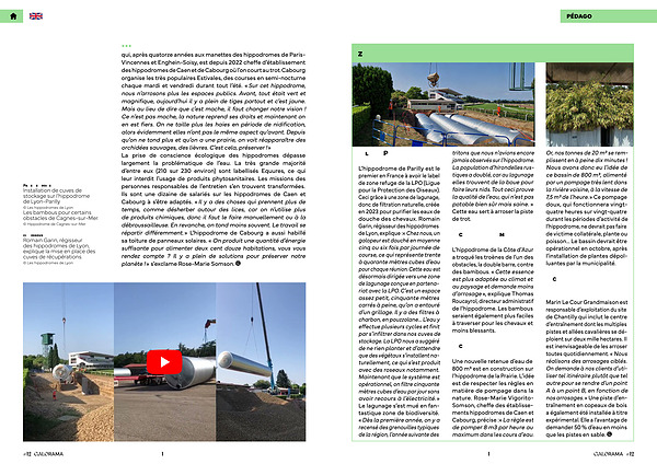 Or, nos tonnes de 20 m ³ se remplissent en à peine dix minutes! Nous avons donc eu l’ idée de ce bassin de 800 m ³, alimenté par un pompage très lent dans la rivière voisine, à la vitesse de 7,5 m ³ de l’ heure. » Ce pompage doux, qui fonctionnera vingtquatre heures sur vingt-quatre durant les périodes d’ activité de l’ hippodrome, ne devrait pas faire de victime collatérale, plante ou poisson... Le bassin devrait être opérationnel en octobre, après l’ installation de plantes dépolluantes par la municipalité.